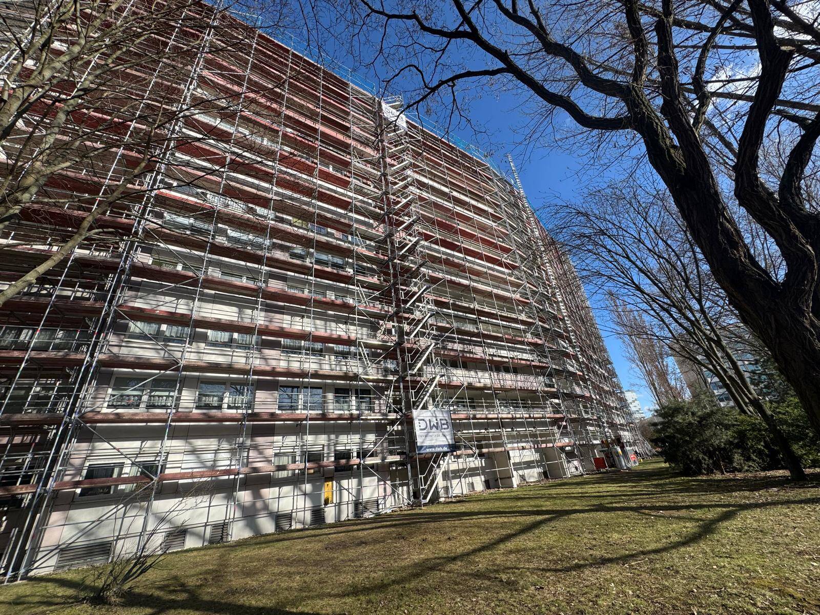 Die Gerüste auf der Eingangsseite werden nun schrittweise bis Jahresende zurückgebaut, beginnend mit der Hausnummer 30.